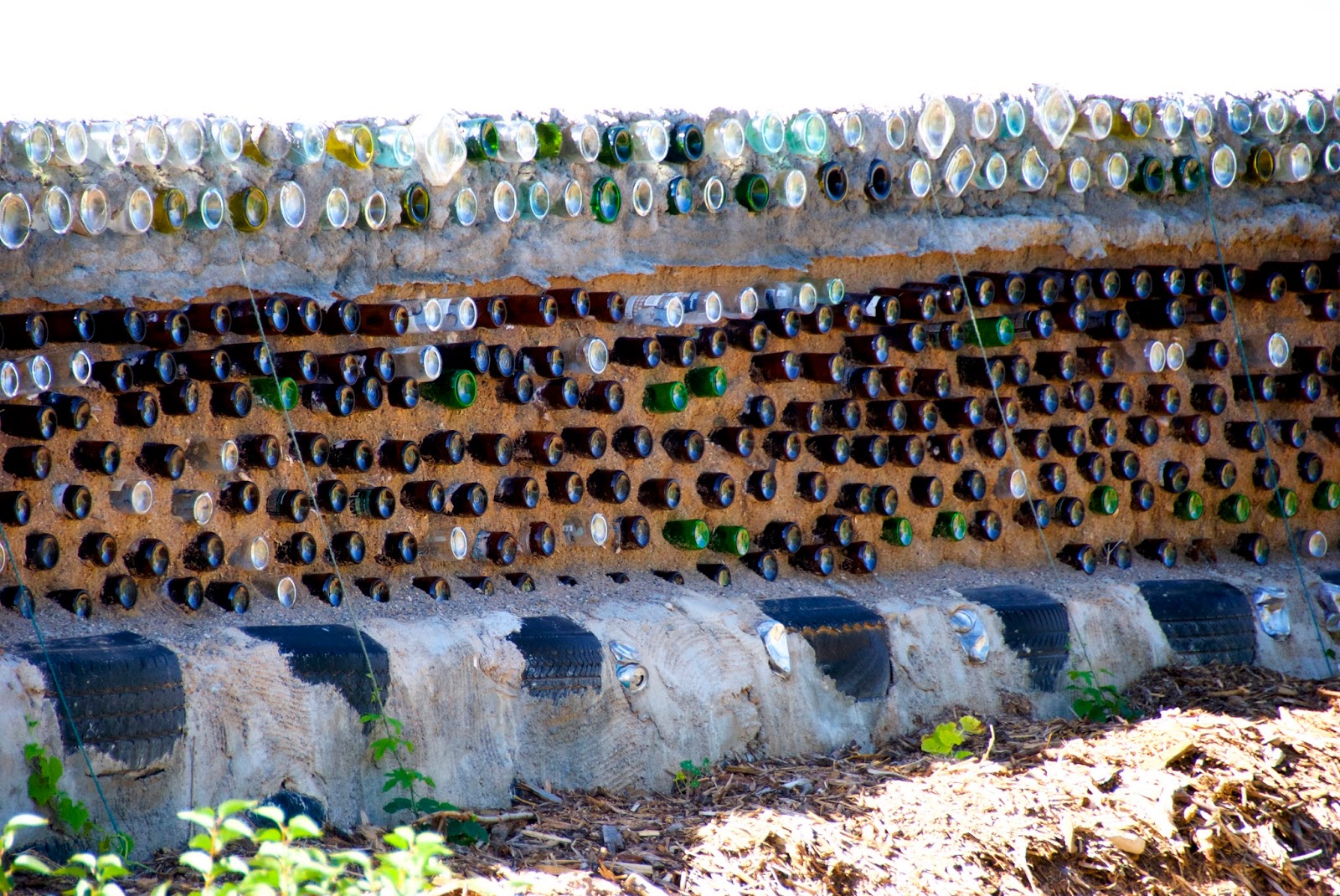 | This allows you to see the recycled tires with rammed earth and the recycled bottles embedded in the wall. |